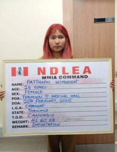 The National Drug Law Enforcement Agency (NDLEA) have arrested a 24 year old Thai lady identified as Pattaphi Wimonnat ,at the Murtala Muhammed International Airport, MMIA, Ikeja Lagos on attempt to smuggle 43 parcels of Canadian Loud, a synthetic strain of cannabis, weighing 46.60 kilograms.