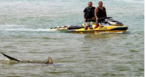An AFP journalist at the site saw shark silhouettes with dorsal fins breaking through the water’s surface.