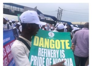 They are marching through major routes, waving placards with inscriptions such as, “Don’t Kill Dangote Refinery,” “#StopsabotagingfuelinNigwria“#EndPENGASSAN,” #EndDAPPMAN,” “#DangoteRefineryIsANationalAsset,” “#StopSabotage, among others.”