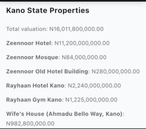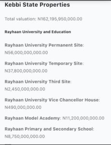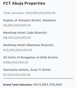 The properties in Kebbi state are valued at N162,195,950,000, while the assets in Kano state are said to be worth N16,011,800,000, and the value of the FCT properties was put at N34,685,000,000.