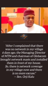 “After I complained that there was no network in my village 6 years ago, the Managing Director of MTN and the chairman of Globacom brought network masts and installed them in front of my house,” Kalu told reporters. “So, there is network coverage in my village now and there is no more excuse.”